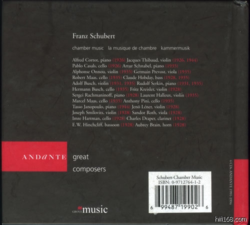 Andante的Schubert室内乐专辑收有Léner SQ. 1928年的“八重奏”,音质比起Rockport Vol.3的同曲好上不少,不过Andante华丽的包装背后不知所谓,CD极易刮花不说(已经挂彩,心痛……),在Léner相关段落仅有几十个单词,对认识这个遥远而又牛X的组合毫无帮助,其他录音也是类似,说明书居然还厚达80页,真是浪费资源。