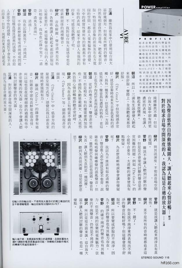 Ayre的 V1后级声音很不错的,中高频的质感和密度很好,低频的活生感和透明度也不错,是少有的晶体管机能出得了胆机的中高频的机子!