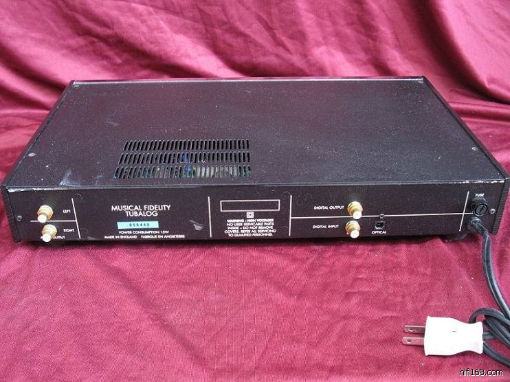 音乐传真MUSICAL FIDELITY TUBALOG胆解码器,用一对荷兰吹喇叭6922,声音温暖润泽,细节丰富,音场开阔,音乐味浓郁。端口齐全,有光纤同轴各一组输入,一组同轴和RCA输出,220电压,成色一般(不锈钢面板有氧化的斑点),状态很好,无修无磨。配一条从南洋音响一手购入的美国King Snake/蛇王高级银膜数字同轴线(http://item.taobao.com/auction/item_detail-0db2-8bde6badef7bb90f4e01e83e9dd31cf6.htm)。明盘实价2400包运,有意请直接一三八26587436联系!