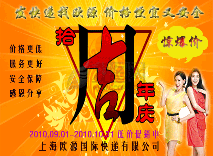 欧源热线:021-63596241。上海国际包裹快递找欧源,价格便宜又安全。2010中秋节国庆节,欧源国际包裹快递十周年,三庆合一特惠价格大酬宾,国际快递超低的价格,超值的服务,解决您的无忧发货。上海欧源利方国际包裹快递有限公司专业经营上海至世界各地国际包裹快递,项目有中国邮政EMS国际包裹快递、中外运敦豪DHL国际包裹快递、UPS、天地物流TNT国际包裹快递等。提供上海至日本、至韩国、至美国、至加拿大、至法国、至德国、至新家坡、至新西兰、至澳大利亚都的门对门国际包裹快递服务。多年来,公司致力于提高服务质量,已经在广大客户中取得良好口碑,安全、便捷、准时、诚信、实惠是我们服务宗旨,让客户百分百满意是我们的服务目标。如果您需要发包裹去国外,在上海市内只要一个电话,我们就马上上门提货,如果在外地,那你可以先发包裹到我们公司,我们再帮您发到国外。