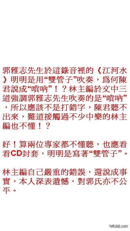 原帖由 MissionLu 于 2010-9-12 13:17:00 发表看过陈德韵乐评全文,单就陈君碟评中那句“单点录音的优点未见,缺点则尽现。斯诚最新反面教材”,个人觉得陈君是有目的带攻击性的低水平之作,实无推广弘扬中乐之心,其遣词用句严重缺乏内容和深度。 郭雅志先生於这录音里的《江河水》明明是用“双管子”吹奏,为何陈君说成“唢呐”!?林镇辉主编於文中三道强调郭雅志先生吹奏的是“唢呐”,所以应该不是打错字,陈君听不出来,难道接触过不少中乐的林主编也不懂!?