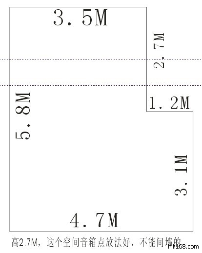 如果是用书架箱,可以考虑用菱形摆位,以左下方的角落(4.7M与5.8M的夹角)为前墙,L型角为后墙,以扩散/反射板来营造空间,这样可以取得最为对称的摆位。但是能不能接受背后有个角位顶住,以及整个空间的其他布置如何进行,那是很重要的问题。