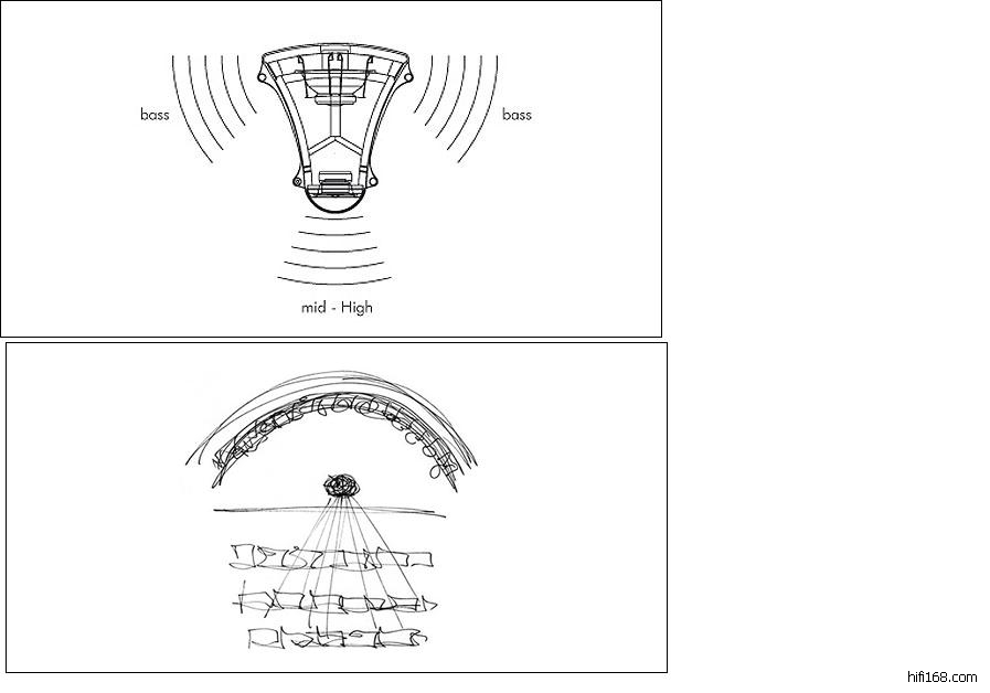 在代理商提供的手繪稿當中,我們大致可以理解Ktema特殊單體配置設計的原因。Franco希望喇叭可以表現出真實音樂廳的聆聽感受,而在音樂廳當中,交響樂團的配置並不是「排排站」,而是弦樂在前、銅管在後,打擊樂更是在最後一排,因此Ktema的中高音單體一如傳統,一樣擺放在喇叭前方,但低音單體則在喇叭背後,外增加一塊反射板,把低音從兩側向外擴散。這樣的設計想法講起來很合理,就是模仿音樂廳的聲響與配置,但實際上卻很困難,大部分喇叭會讓高、中、低音單體排成一列,就是為了讓各頻段的聲響達到一致的時間相位,當我們把低音單體擺在喇叭後方的時候,如何讓低頻與中高頻達到一致的時間相位,就成了新的難題。