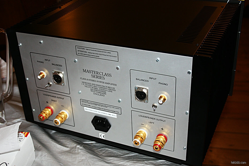 Masterclass AA后级,纯A类晶体设计,配置RCA与XLR输入端子各一组、WBT喇叭接驳端1组,输出功率50W(8Ω)/70W(4Ω),频率响应15Hz-30KHz±0dB,输入阻抗20KΩ(非平衡)/22kΩ(平衡),增益26dB,讯噪比大于85d8,分离度大于90d8,失真0.007%1kH2/1W,最大消耗功率500W,尺寸430x250x360mm(宽X高x深),重量24Kg。