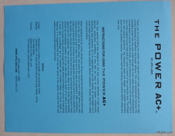 先来看一下包装,很简单,就是一个薄纸盒,花哨的包装最终还是会转嫁到消费者头上,因此价格厚道的低调厂商美国JPS公司在这条电源线的包装上省到位了。