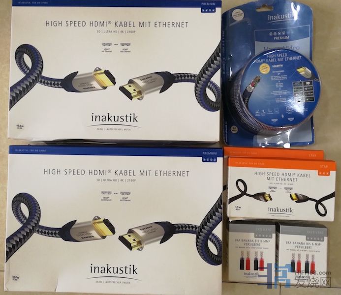 HDMI线是德国敏力的有10米,8米,7米,2米,1.5米。还有一付美国MIT的RCA信号线1.5米