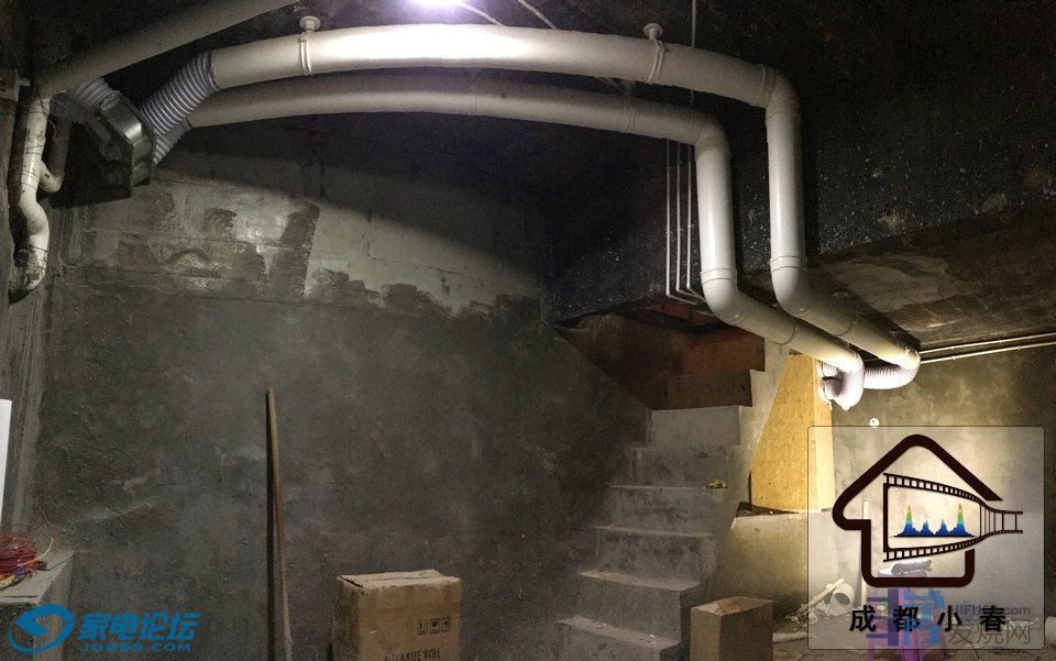 现在我们以超级便宜的松下FV-14CG2C为例来做一个实作,先分析基础参数,功率33瓦不算大,风量300立方每小时比较可观,静压98克服阻力的能力不乐观。噪音41dBA极为悲观。在实作中我用了4台,两台正压送入24平视听室,视听室排风口直接两条150PVC管连入35平地下室,2台负压从地下室抽走排到室外;下图为整个系统送入视听室的前半程(3个约90度的直角实在是妥协严重)。