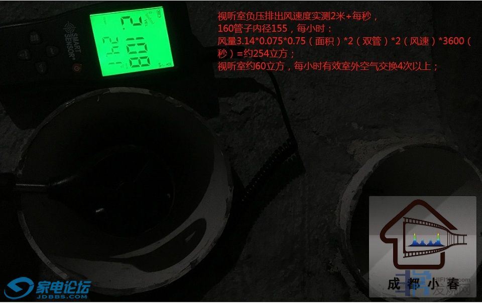 视听室负压排出风速度实测2米每秒,160管子内径155,每小时:风量3.14*0.075*0.075(面积)*2(双管)*2(风速)*3600(秒)=约254立方;视听室约60立方,每小时有效室外空气交换4次以上;假设只算2路,254/(300*2)=风量损失6成。