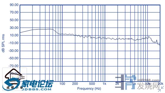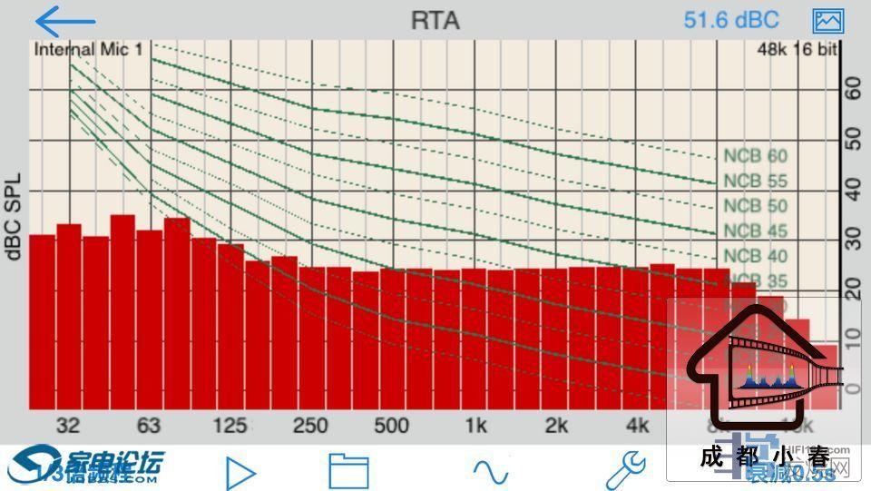 还有一个很严重的问题,这个风机是便宜且风量又大,但缺点是噪音比较大,所以采取了视听室外安装风机+管道静压风箱隔离的处理办法,效果是比较显著的。下图为视听室新风运行中的全频段噪音频谱,60HZ以下低频段为最高电平,约28DB,以上频段基本在10DB以下,确保每个人来一定安静得出耳鸣。