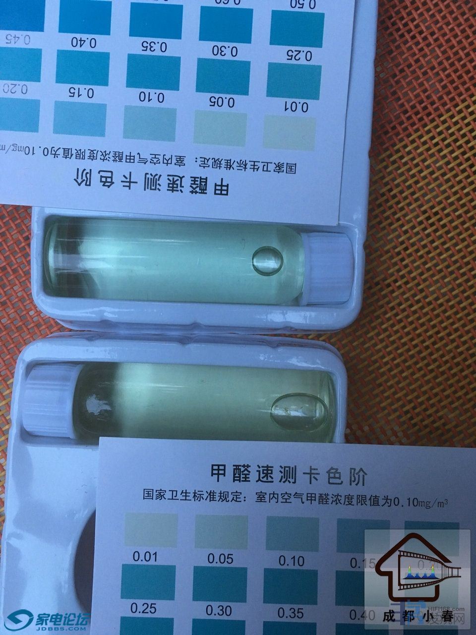 水泡小的(上)为新风系统运行中的结果,水泡大的(下)为密闭24小时所测试的结果;都是在0.05以下。