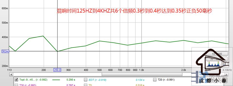 取125HZ到4KHZ的国际6个倍频混响时间约0.3到0.4秒,达到0.35秒正负50毫秒。