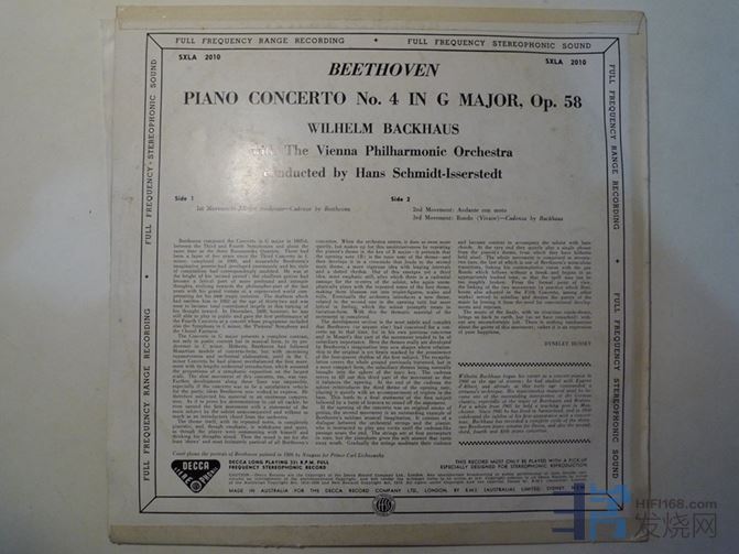 巴克豪斯演奏贝多芬第四钢琴协奏曲,大DECCA澳大利亚压片,碟面只是表面痕迹,播放比较安静,唱片是立体声,封套的正面是单声道版,背面又是立体声,是个错版,90块