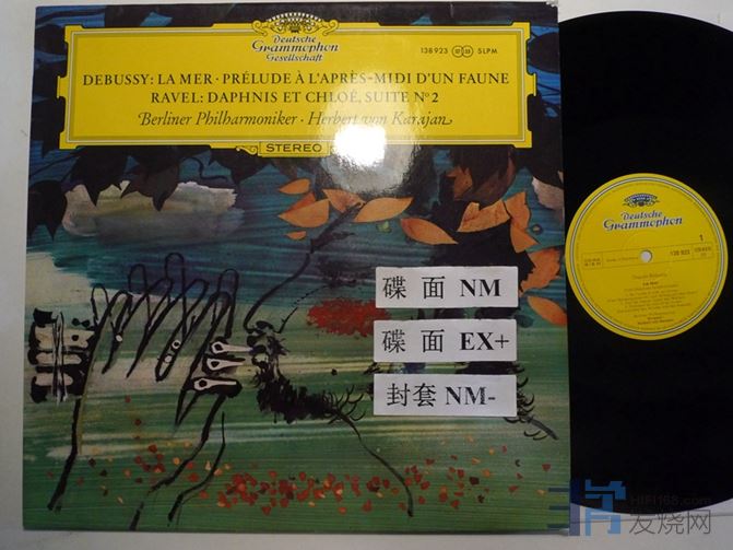卡拉扬指挥德彪西“大海”,“牧神午后前奏曲”,拉威尔“达芙妮与克洛伊第二组曲”,DG德国压片,德彪西这一面有一条长的表面细纹,经过没有任何噪音,40块