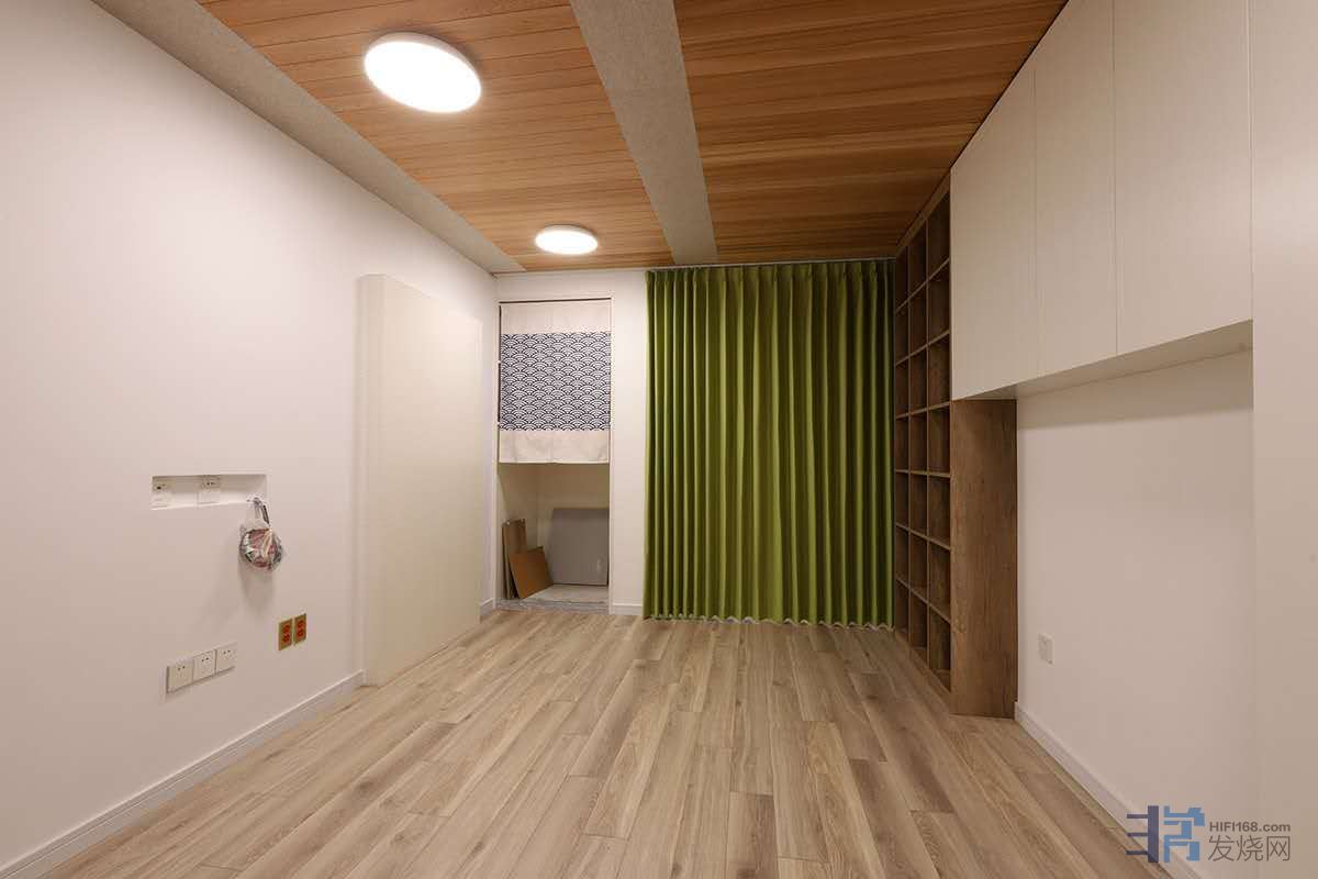 老破小+客厅党,尺寸不够。首先房间纵深过窄,只有不到3.1m。如果前后左右四面石井,空间会小很多,注定压抑。这块地方作为客厅的一部分,也要兼顾家人的舒适和方便,所以在音箱的两侧都做了半开放式设计,各一面可移动的窗帘,隔断兼吸音,谈不上隔音了。而两侧房间和阳台的窗户,全部用了三层夹胶玻璃,至少隔绝些外部干扰,聊以**。