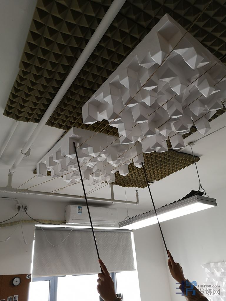 这个空间实际试下来,左侧墙的两个飘窗对声音影响还是比较大的,所以我选择了把帘子放下虚拟侧墙的处理方法应对。右侧墙吴先生用的木丝板效果不错,这种木丝板密度相较我以前看到的要高些,但也不能多用。我拿了一块20*180cm的放在侧墙试了下还是感觉有点吸过头,所以不宜多用。