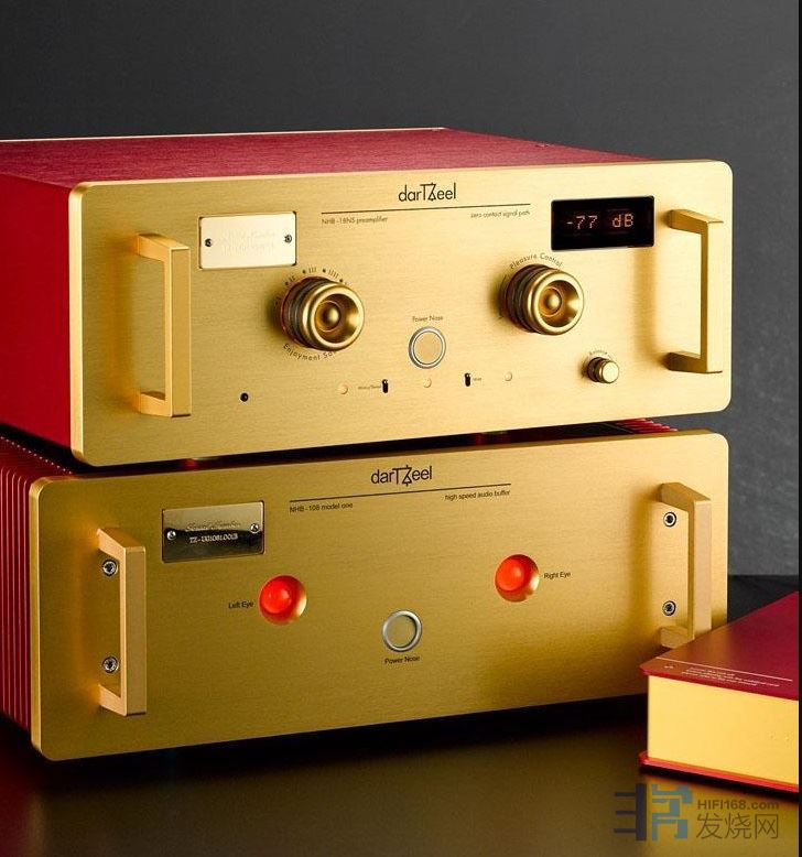 darTZeel器材的设计,外观以贵族金色和火红色为两大元素,设计富有金属硬朗的气质,与“钢铁侠”如出一辙。机箱与面板据说采用了一种AW-5754(ALMg3)铝合金通过CNC加工车制,制作时每块功放线路板都会经过严格的检测再装入机箱中,线路板不以铜柱固定在机身上,而是用弹性厚橡胶垫隔开,再以直立式安装来避震。