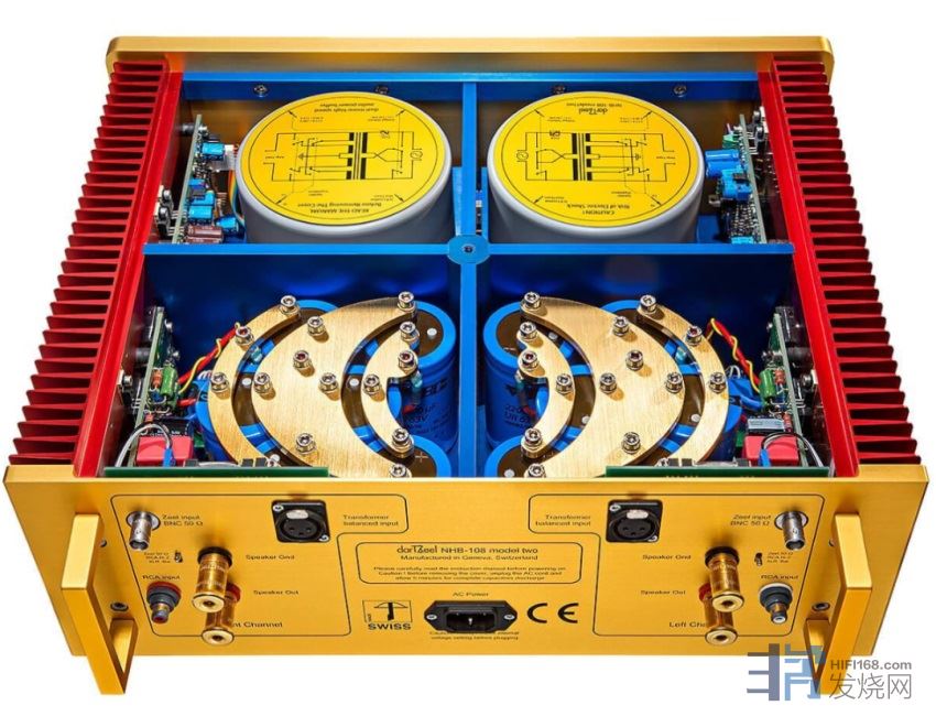 NHB-108以造型漂亮的超厚镀金铜板来连接滤波电容,每声道六颗电容以弧形排列,不仅更加紧密节约机内空间,同时还让六颗一组的大容量滤波电容站立得更稳。