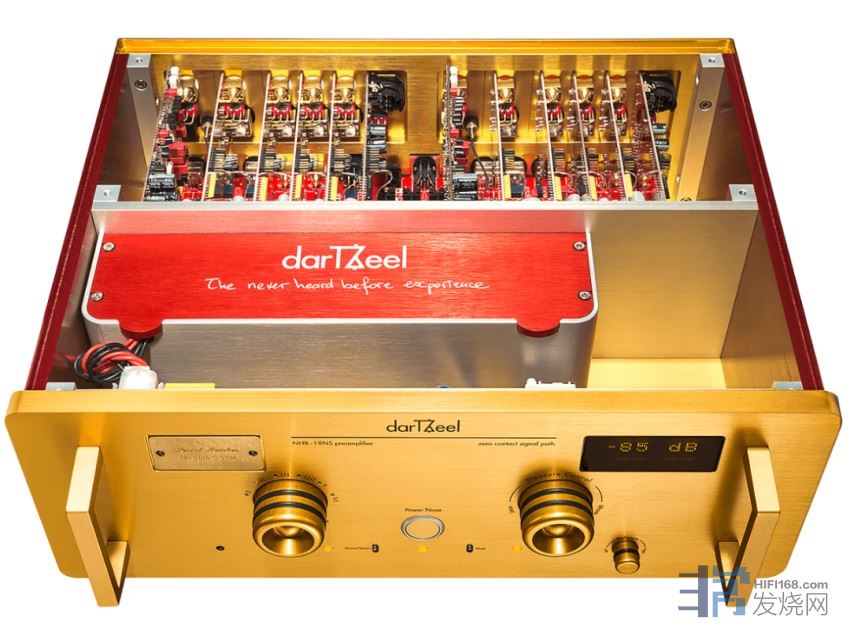 另外值得一提的是,darTZeel设计器材依然坚持三大原则:极简、极纯以及极可靠。所以放大线路中没有施加整体负反馈,没有继电器,没有保险丝。每声道从输入到输出都只有有限的晶体管。