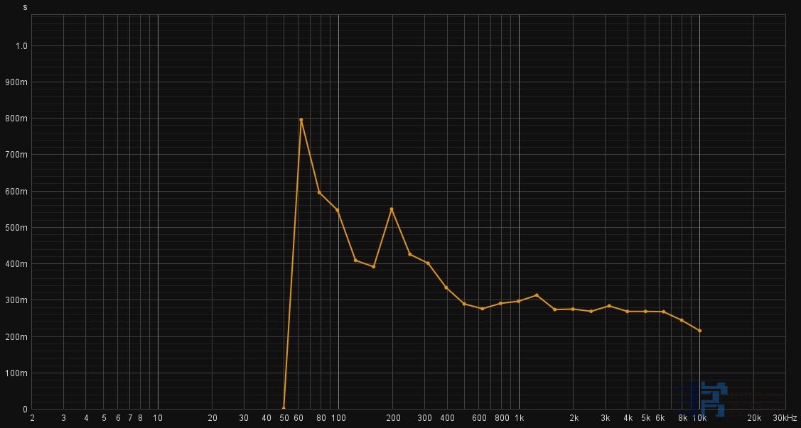 最终调整音箱摆位过后的听音室的测试结果,房间对频率的响应如下,整体在+/-5db的范围,考虑到音箱(NS16音箱)本身有+/-3db的波动,效果应该说是非常理想了(100Hz以下不用太多看,因为音箱本身就已经开始衰减了)。在200Hz附近有一个5db的凹陷,应该是房间后面空间的驻波造成的,但影响应该很小了。