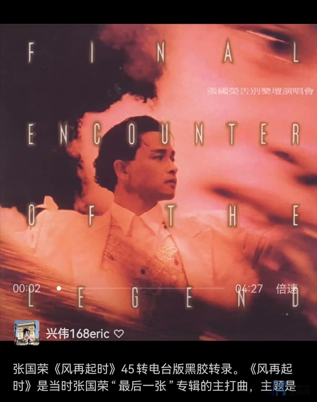 最近在E版的宣传下关注邝医生的视频号,视频号是黑胶转录,但张国荣的声音明显没有E版在邝医生家录的现场声音有激情张力,很奇怪。难道是现场播放有源超低音烘托出了更多激情?还是转录比手机录现场有更多的压缩?
