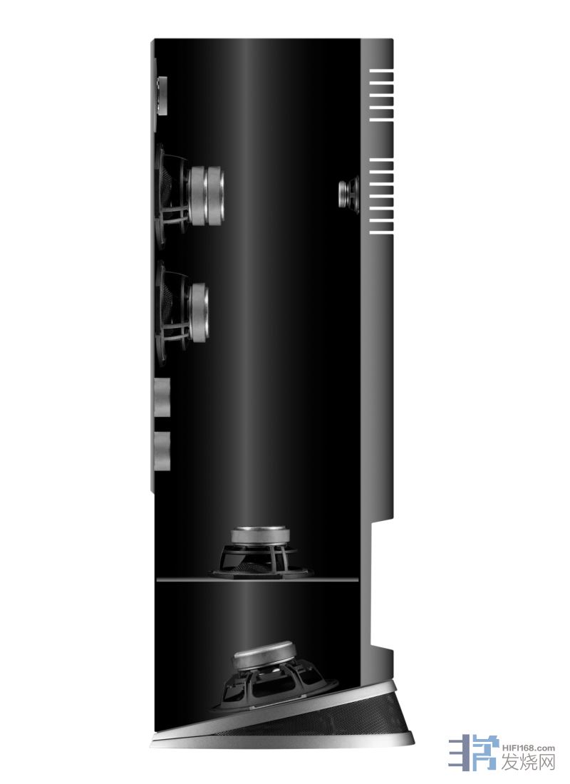 R6 前障板上的中低音驱动单元均为 6.5 英寸碳纤维音盆,采用钛线圈技术,使用三点悬浮式锁固方式,膜片由 “交织芳纶复合纤维”制成,在丹麦手工制造。高音单元采用 R AMT Arrete,与 R3 极点 相同。现在,如果您已经回去再次阅读 R3 的评测,就会发现 R6 除了在外形上比 R3 更大之外,还在前障板增加了几个倒相口,但,这肯定不是唯一的区别! R6箱体内部隐藏着另一个 6.5 英寸内置低音驱动单元,和一个向下发射的 8 英寸低音单元,它们采用等压(相同压力)配置。等压低音并不新鲜,许多人都记得 Linn和  WilsonBenesch都采用了这种系统。等压低音系统(Audiovector 称其为等压复合低音系统)通过箱体中的空气将两个低音驱动单元的质量耦合在一起。
