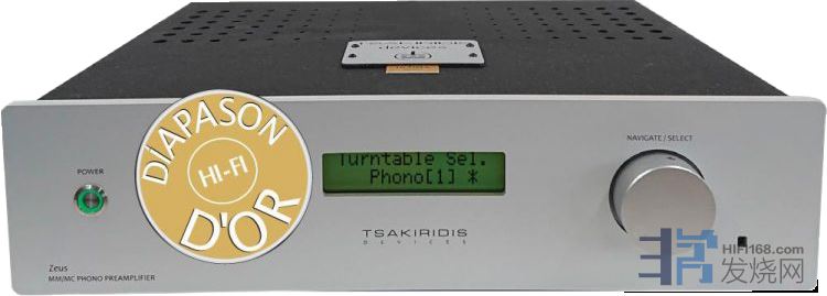 Tsakiridis (神曲)制造电子管放大器,始于 1987 年。Zeus(宙斯)唱头放大器是个例外,它采用了运放+电子管混合原理。使用电子管的难点在于实现完美的静音电路:对于MM动磁增益为100倍、MC动圈增益为1000倍的电路而言,这并非易事。正如这家雅典制造商通常所做的那样,Zeus(宙斯)有不同的版本:标准版及Ultima终极版。Zeus 使用运算放大器,然后是一个阴极跟随器电路的6DJ8双三极管的电子管输出级,实现输出阻抗匹配。具有参数设置界面,可通过旋钮或红外遥控器控制,液晶屏上以清晰的文字显示参数。宙斯可输入两组唱头,参数包括MM动磁 或 MC动圈类型,增益为42至68 dB,电阻负载MC 为 125Ω至1kΩ,MM为47kΩ,电容22pF至102pF(四档)。参数存储在内存中。输出包括非平衡RCA 及 平衡XLR。除了改进的结构外,Ultima 版本还采用了包括 Mundorf 油浸电容器在内的高品质元件。
