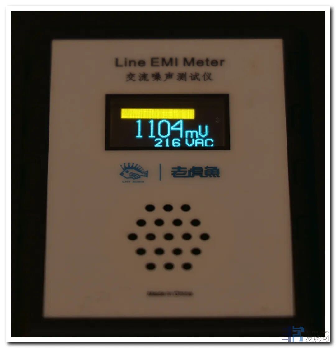 先用电源噪声测试器测一下我家的电源噪音:1100左右,测试器都发出明显的嗡嗡声,**显示条几乎拉满。