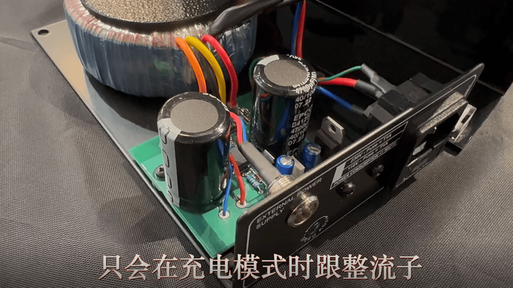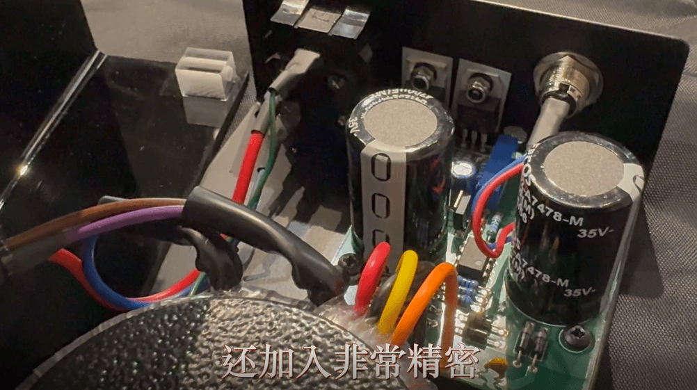 外壳选用黑色亚加力胶板精制而成,占地空间不多的 HR 供电器,机背除设有微型平衡直流输出插座,还提供一组转速微调旋钮。HR 供电器 与随机而来分体供电器之间的最大分别,在于前者不但配备大容量环型变压器,还加入非常精密 Never-connected 永不连接 供电线路,其核心零件:2枚负责储存能量的电解电容器,只会在充电模式时跟整流子与及供电变压器相连;当进入放电模式时,原本相连的交流供电线路就会自动截断,单纯为动力马达提供所需能量。倘若2枚电容器的能量储备接近耗尽,透过高速晶体管进行开关的 永不连接 供电线路,就会再次自动进入充电模式。